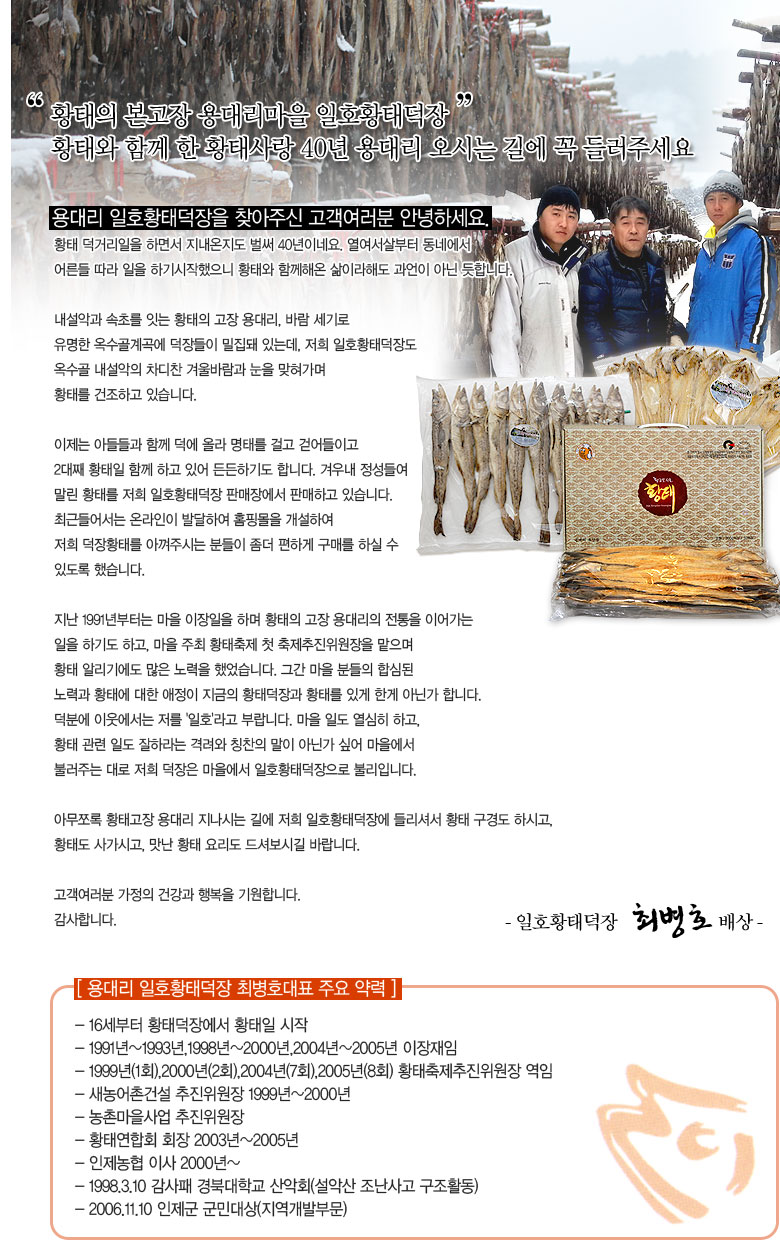회사명 : 일호황태판매장 | 사업자등록번호 : 223-04-65695 [사업자정보확인] | 주소 : 강원도 인제군 북면 미시령로 1260 일호황태판매장